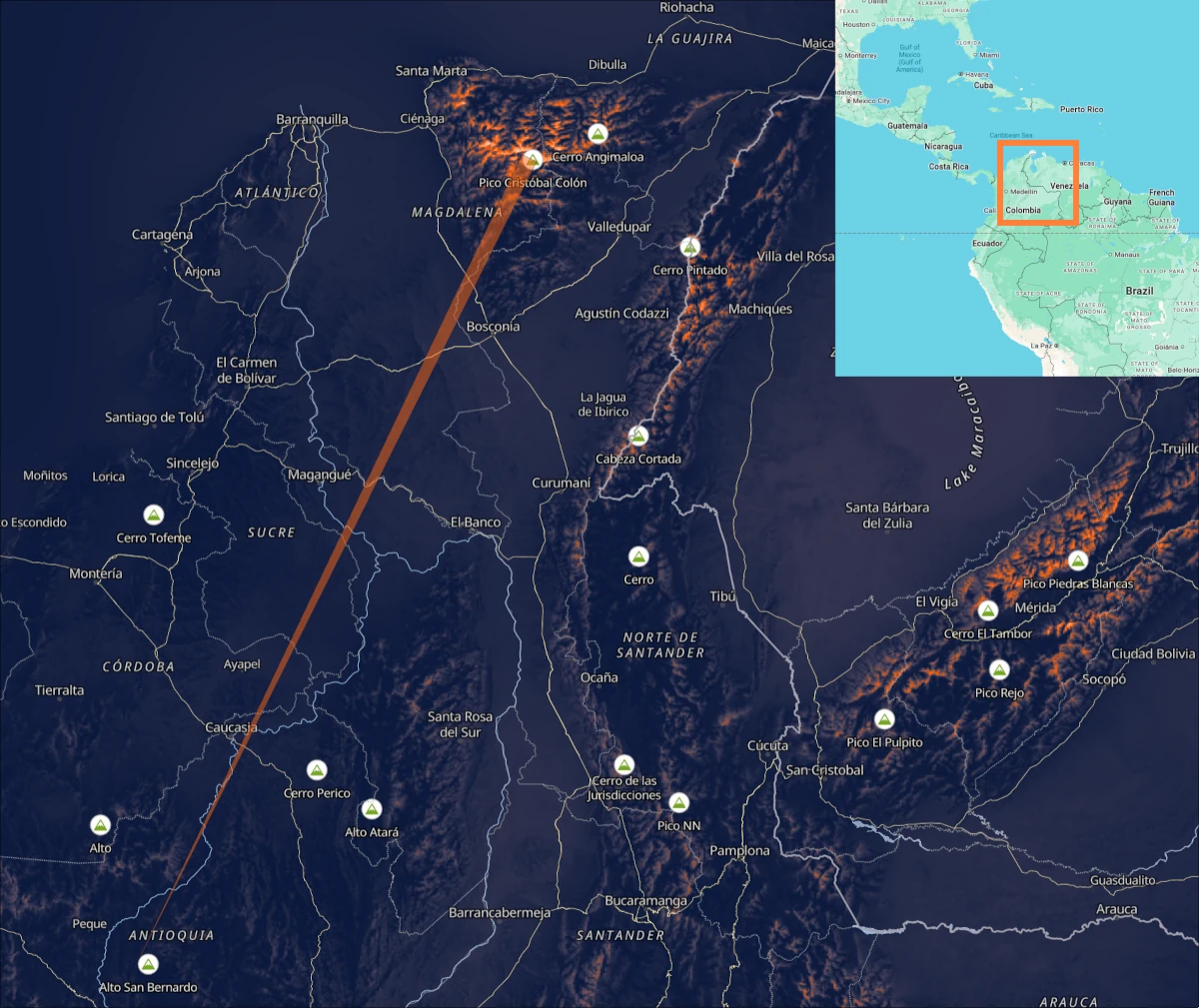 Now we go right to the other side of the world to Colombia in South America. We’ve found a line of sight from the department of Antioquia to Pico Cristobal, Colombia’s highest mountain.